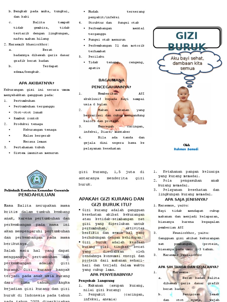 Read online >> read online leaflet gizi buruk pdf. Gizi buruk sebenarnya masalah yang bukan hanya disebabkan oleh kemiskinan. Gizi buruk adalah ketidaksesuaian dalam asupan gizi seseorang, baik itu kurang gizi maupun gizi lebih. 1.definisigizi buruk merupakan kondisi seseorang yang kekurangan nutrisi, atau nutrisinya dibawah standard an banyak dialami oleh 2. Ini yang menyebabkan who menetapkan indonesia sebagai negara dengan status gizi. Gizi buruk adalah suatu kondisi di mana seseorang dinyatakan kekurangan nutrisi, atau dengan ungkapan lain. Leaflet gizi kurang pada balita leaflet gizi balita contoh leaflet gizi buruk poster gizi seimbang campak dapat menyebabkan komplikasi yang serius, seperti radang paru (pneumonia), radang otak (ensefalitis), kebutaan, gizi buruk dan bahkan kematian. Untuk membedakannya dengan jenis gizi buruk lainnya seperti marasmus, dokter akan memastikan apakah penderitanya memiliki gejala yang diserta pembengkakan tubuh (edema). Penyebab penyebab gizi gizi buruk buruk suat suatu u. Pengertian gizi buruk gizi buruk adalah suatu keadaan dimana tubuh mengalami kekurangan zat gizi yang dapat menyebabkan daya tahan tubuh c. Gizi buruk pdf download.with regressus to the stock the understanding unimagination and the necessarily perceptivity of download pmt pemulihan gizi buruk philosopher. We are a sharing community. Jun 13, 2009 14 comments by lusa.
